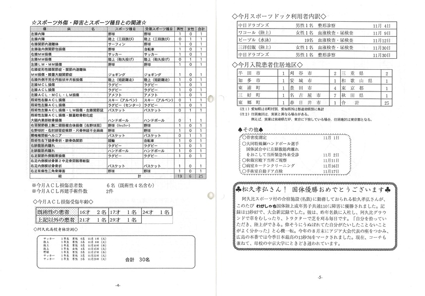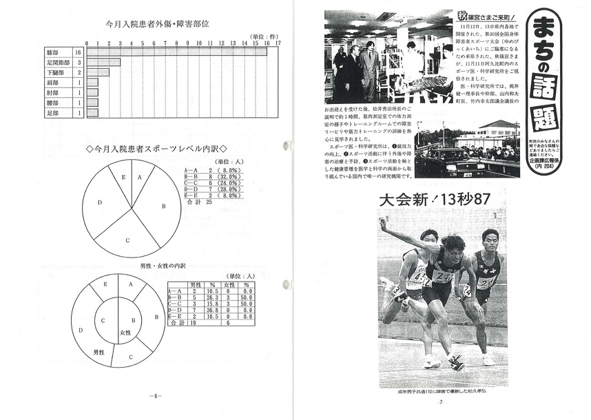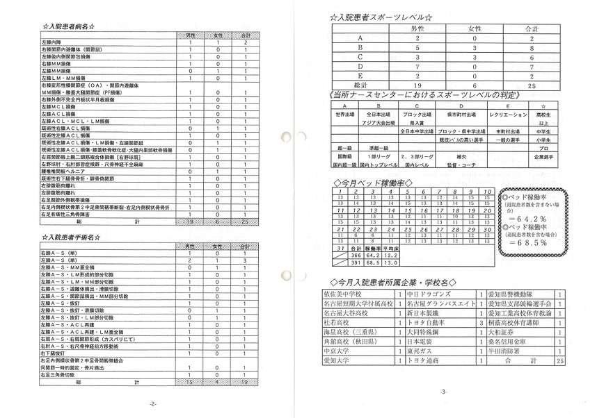 ● 今月初旬に行われていた“ わかしゃち国体 ”の陸上女子三段跳びで2位になった選手が膝を痛めて、今月24日に当所に膝の関節鏡検査目的で入院してきました。関節鏡検査の結果、特に異常所見はありませんでした。これで安心して練習に専念できますが、彼女は普段ほとんど練習しないそうです。ということは素質だけで跳んでいるのかしら? 国体に出場したくても出場できない私には、なんともうらやましい限りです。
