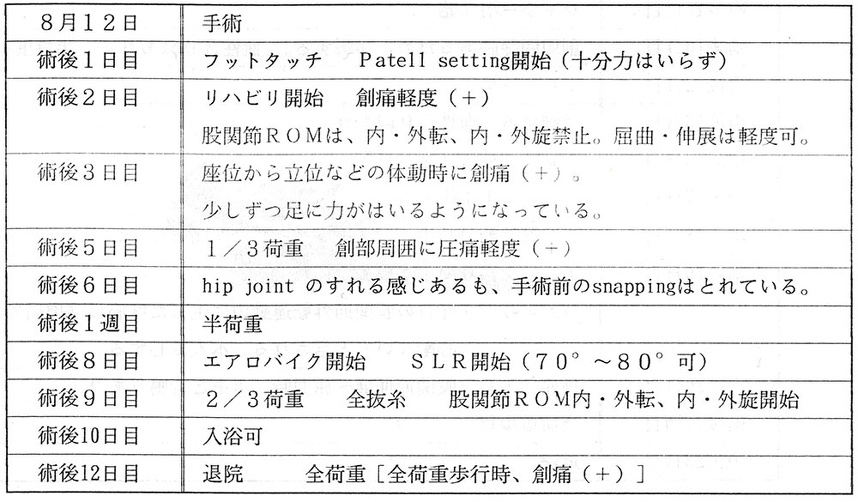 術後2週目頃から、松葉杖なしで歩けるようになり、術後3週〜4週目頃から、ジョグが開始となる。