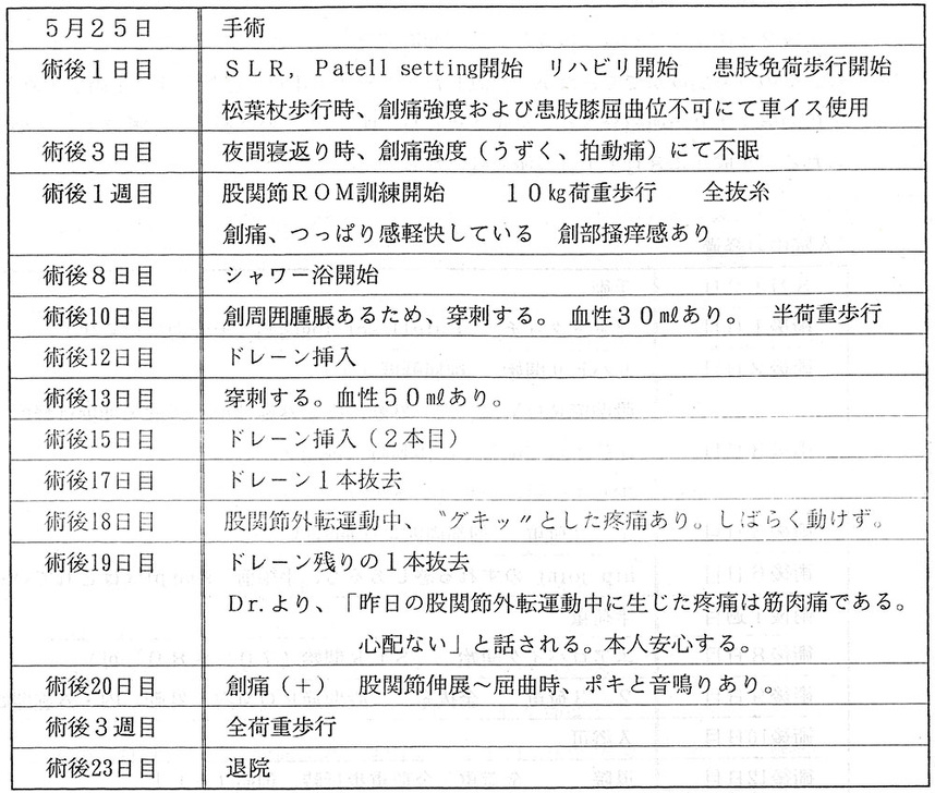 手術後の経過としては、術後5日〜10日目頃から徐々に股関節のROM訓練が開始となる。