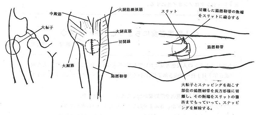 バネ股の受傷機転ははっきりしない。おそらくオーバーユース、股関節のアライメント、股関節の動かし方、体質的な要因などから発生してくるのであろう。ここに紹介した3症例では、知らないうちに大転子部に股屈曲時にパチンという雑音、 疼痛などの症状が出現している。初めはたいしたことはないと思っていると、徐々に症状が増強してくる。