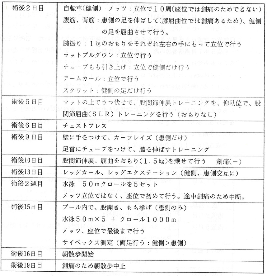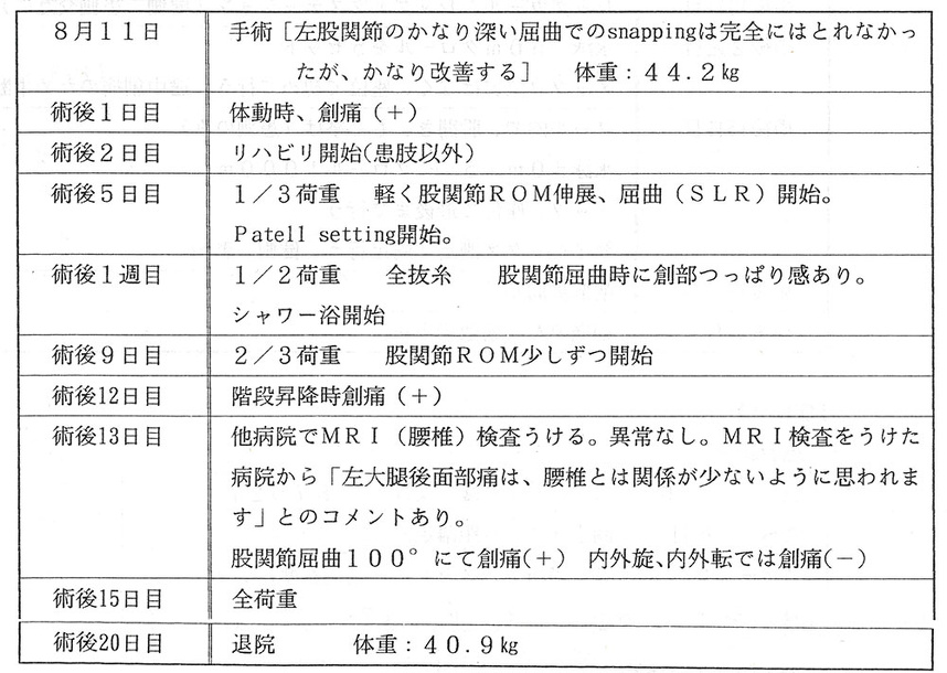 ※ 医師より「術後3週〜4週目頃からジョグ開始。術後5週目頃には、かなりジョグできるようになるでしょう」を説明を受ける。