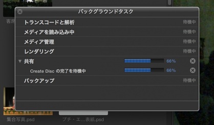 FinalCut ProXで作成した1時間5分のビデオをDVDに書き出しする(共有する)と、バックグラウンドタスクで66%まで進むと、そこから先に進まない。